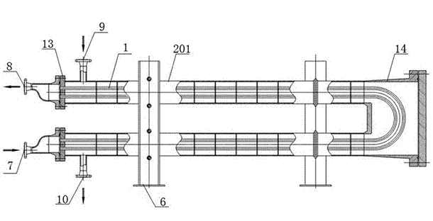 U形管式換熱器,每根管子都彎成U形,兩端固定在同一塊管板上,每根管子皆可自由伸縮,從而解決熱補償問題。管程至少為兩程,管束可以抽出清洗,管子可以自由膨脹。其缺點是管子內壁清洗困難,管子更換困難,管板上排列的管子少。優點是結構簡單,質量輕,適用于高溫高壓條件。